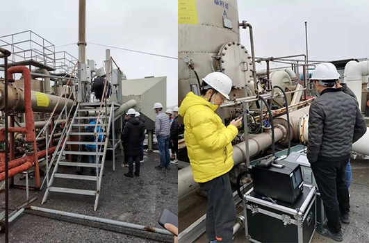 各廠家抵達工況現(xiàn)場,下午13點開始架設(shè)設(shè)備、預(yù)熱儀器,由于天氣潮濕原因SE3800開始時點火困難,經(jīng)過一段時間的預(yù)熱,儀器FID成功點火,15分鐘后FID基線平穩(wěn),儀器狀態(tài)良好,可以實施監(jiān)測工作。13點40分,所有廠家儀器準(zhǔn)備就緒,同一時刻開始進行監(jiān)測工作。樂氏科技與嶗應(yīng)將儀器采樣探針插入工藝入口,開始采集樣品收集數(shù)據(jù)。